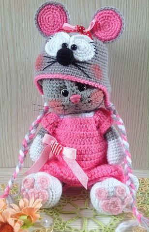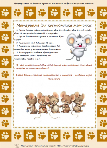 Мастер класс в формате pdf на 35 страницах, подробное описание вязания кошечки Анфисы, костюмчика мышки (шапочка, комбинезончик и рюкзачок) со множеством фото и пояснений. Костюмчик подойдет для игрушек ростиком 19-22 см и обхватом головы 19-20 см.