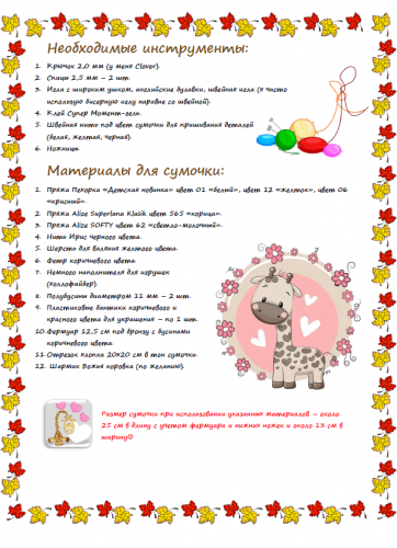 Авторский мастер-класс в формате pdf на 21 странице, содержит подробное описание всех используемых материалов (наименование пряжи, карта цветов), вязания деталей сумочки, сборки и оформления со множеством фото и пояснений.