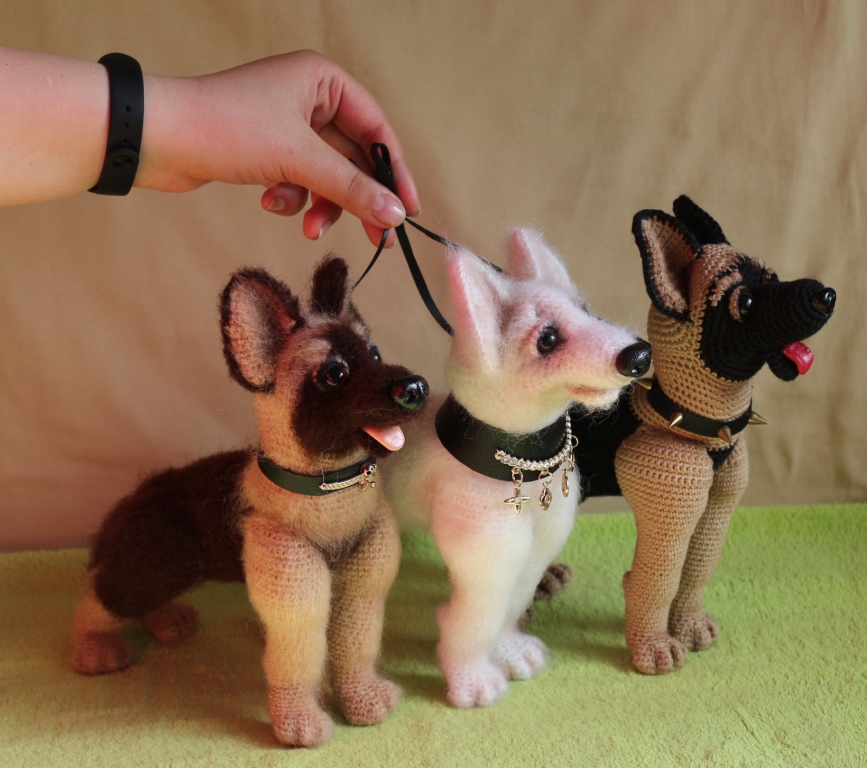МК "Овчарка" Митровци Татьяна. Собаки связаны по одному описанию, из разной пряжи (хлопок, ангора, акрил). Высота 23см,длина (без хвоста) 24см.