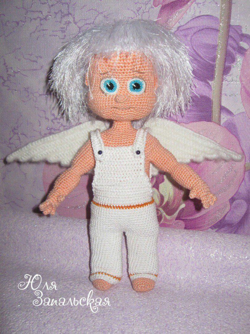 Рост 26 см. Связаны из Yarn Art Begonia крючком Tulip №1,5, крылья YARN ART Angora RAM китайским крючком №2, глазки из Yarn Art Canarias китайским крючком 0,7. Волосы у девочки из Alize Forever, у мальчика из Yarn Art Jungle китайским крючком №3