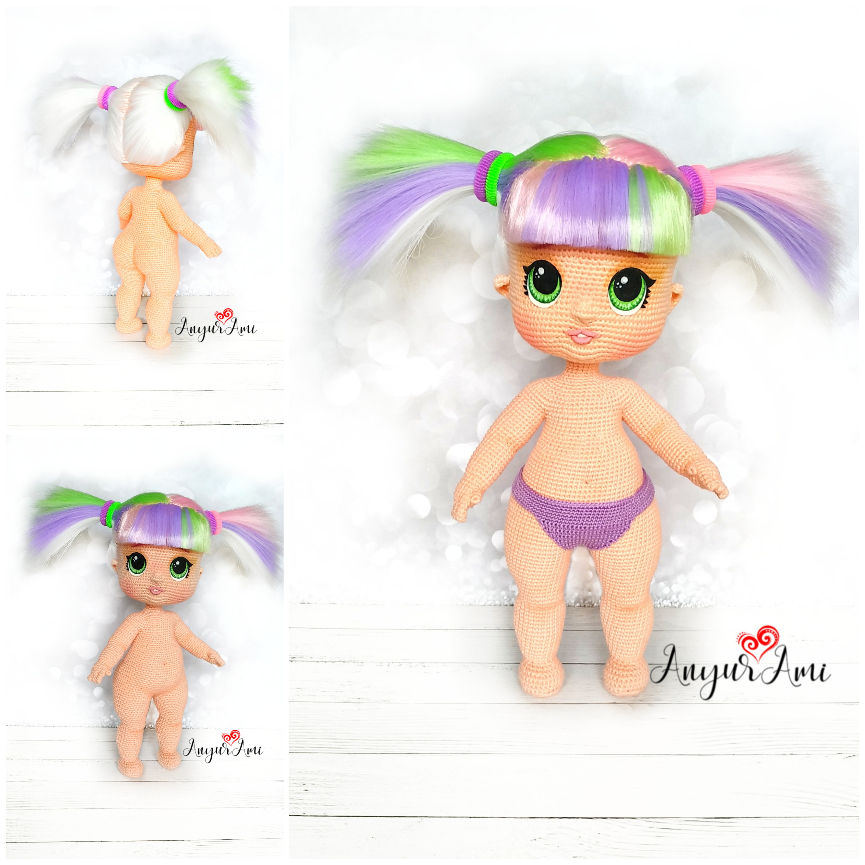 Куколка (кроме трусиков) связана из пряжи Газзал Беби Коттон крючком Кловер Софт 1,5 (ладошки и пальчики - 1,25), внутри проволочный каркас, голова на подвижном креплении, глазки нарисованы акриловыми красками на ткани. Волосы - трессы четырёх цветов. Высота куклы без наряда 32 см.