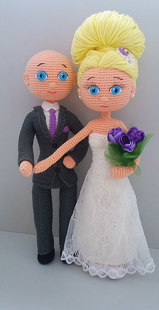 Жених и невеста с элементами портретного сходства. В качестве основы при вязании и жениха и невесты взято описание невесты от автора Havva Ünlü с моими изменениями). Рост жениха 30см, невесты – 28см без прически. Куклы полностью на проволочном каркасе, самостоятельно стоят и сидят, одежда и обувь полностью съемная.