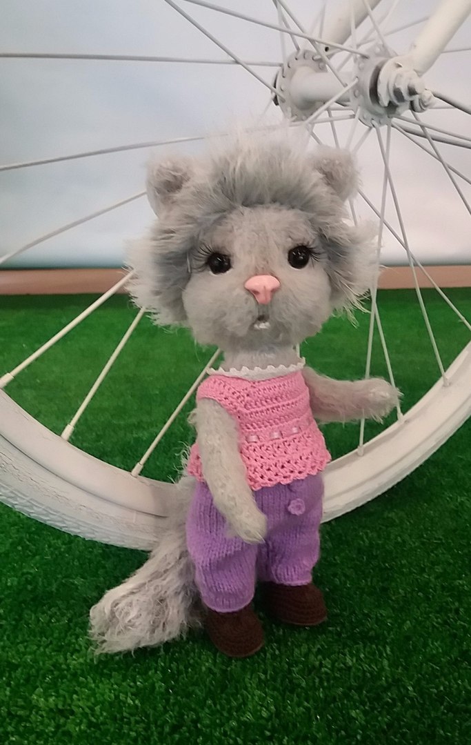 Рост игрушки с ушками - 25см. Голова и лапки на шплинтовом креплении. Сидит самостоятельно, стоит сама, если словить точку равновесия. Носик вылеплен из пластики. Одежда и обувь съемная.