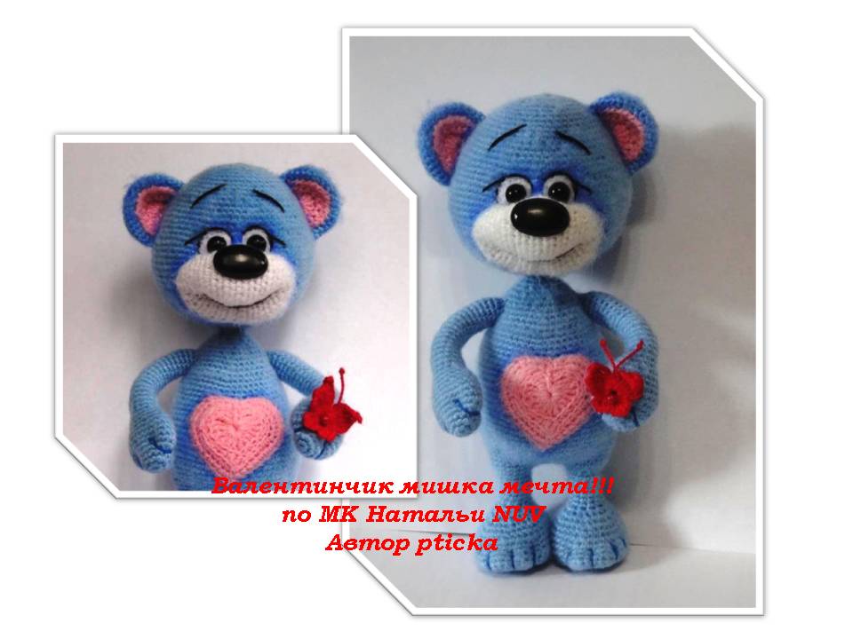 Собираю потихоньку не собрышей, вот первый мишка Валентинчик! Рост у нас 18,5 см, связан из Бисерной пряжи, крючок №1,25. Декорирован акрилом и вышивкой. Автор Наталья NUV