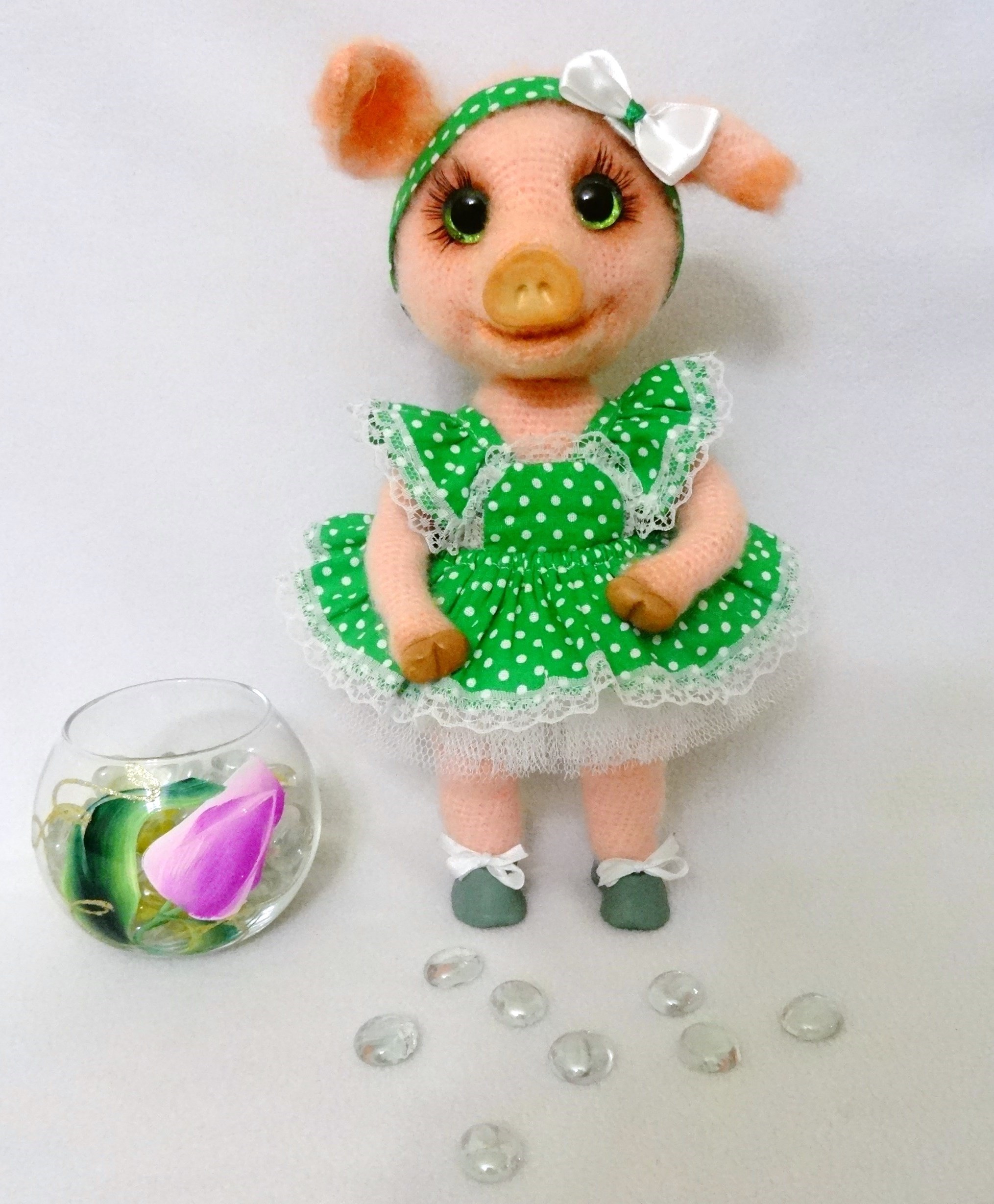 А у меня вот такая свинка, символ следующего 2019 года. Зовут Маруська. очень подвижная девочка. ручки и ножки на каркасе , поэтому сгибаются. В Голове и ручках пластиковые суставы, они подвижны. связана в новой для технике с внутренними утяжками. Ростом 26,5 см, стоит сама. связана в онлайне по Мк Натальи Трофимовой.