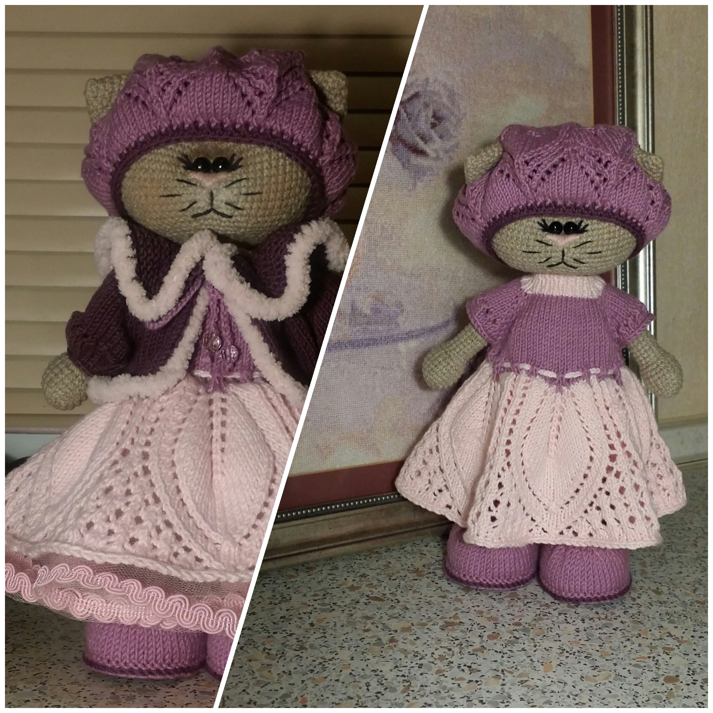 Это моя вторая вязаная игрушка, которая, как и заяц, получилась в результате миксования разных видео с ютюба, берет и курточка - моя фантазия. На этом я прекратила вязание зайцев и кошек такого плана)
