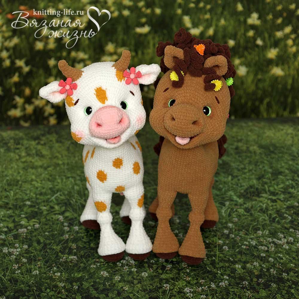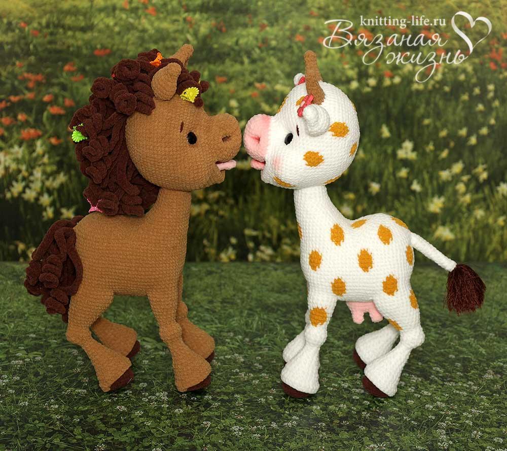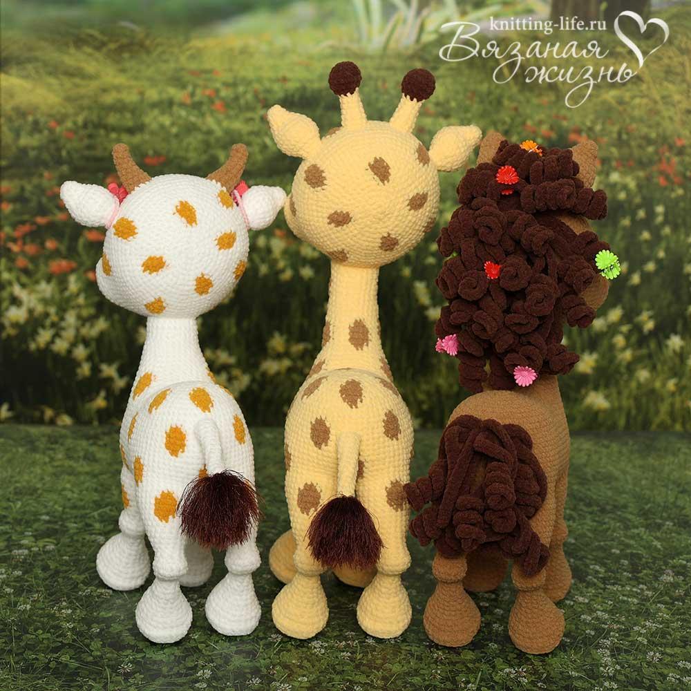 zovutka Опубликовано: 28 февраля Жалоба Поделиться Опубликовано: 28 февраля Дорогие рукодельницы! Приглашаю собраться в тёплой компании и связать солнечного жирафика и его очаровательных подружек - лошадку и коровушку Для участников онлайна как всегда самые выгодные условия! По цене МК на жирафа без видео я дам вам описание для трёх персонажей и видео для самых сложных моментов! Стоимость участия в онлайне - 550 рублей! На видео я покажу: соединение копыта с ногой вывязывание «суставчика» на ноге вывязывание пятнышек соединение ножек с тельцем вязание первых 10 рядов мордочки вязание вдоль цепочки (отверстие для ротика) вывязывание ротика вывязывание глазницы набивку мордочки соединение головы с телом набивку головы Сложность вязания - выше среднего. Если ваш опыт вязания игрушек небольшой, берите простую пряжу - акрил или полухлопок. Жираф самостоятельно стоит без использования каркаса, может присесть на задние ножки. Билетики ЗДЕСЬ Стартуем 14 марта! После оплаты заходите пошушукаться в нашу Тайную комнату Для вязания вам потребуется: Для игрушки подойдёт любая пряжа на ваш вкус, я использовала китайский матовый велюр (100% полиэстер, 135 м/50 г) – двух мотков основного цвета хватает впритык, лучше иметь запас. Для жирафа: основной цвет светло-жёлтый, немного тёмно-коричневого для копыт и рожек, бежевого для пятнышек. Для коровы: основной цвет белый, медовый для пятнышек, бежевый для рожек, светло-розовый для вымени и мордочки. Для лошадки: основной цвет бежевый, для копыт, гривы и хвоста – 50-60 г тёмно-коричневого. Для всех понадобится немного тёмно-красного для ротика и розового для язычка. Крючок 2,25 мм Clover или любой другой, удобный вам. Для кисточки на хвосте жирафа и коровы немного Lanoso "Single" (90% полиамид, 10% полиэстер, 70 м/100 г), цвет 924 коричневый. Можно сделать кисточку из основной пряжи тёмно-коричневого цвета. Для вставочек в копыта – 4 монетки по 1 рублю, можно использовать старую пластиковую карточку или другой плотный пластик. Для «суставчиков» ножек – 2 деревянные бусины диаметром 10 мм и 2 диаметром 12 мм. Можно заменить холлофайбером. Наполнитель (холлофайбер). Глазки на безопасном креплении со скошенным зрачком, у меня диаметром 14 мм. Можно использовать глазки-пуговки. По желанию – сухая пастель для тонировки, вы можете тонировать любым другим привычным вам способом. При использовании указанных материалов рост жирафа - 33 см, коровы и лошадки – 29 см. Ларистотель, Людмила123 и chernyshka 1 2 Цитата Ответить Ссылка на комментарий Поделиться на других сайтах Больше способов поделиться...
